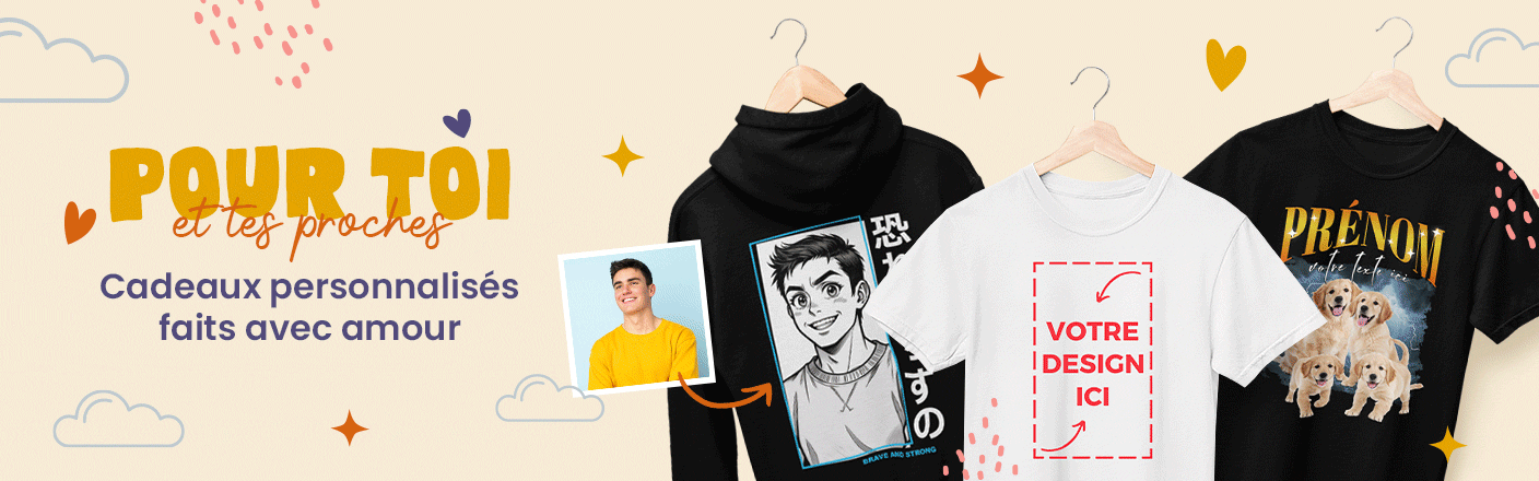 Si vous êtes en quête d’idées originales pour un cadeau personnalisé, notre site propose une large gamme d’articles : du tee-shirt personnalisé au sweat-shirt personnalisé conçu pour vous, ou juste personnaliser un mug... nous avons tout ce qu’il vous faut !